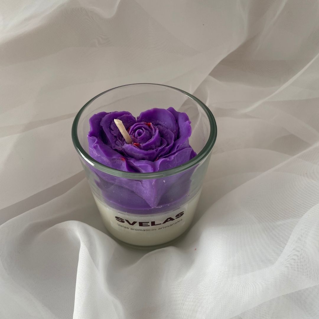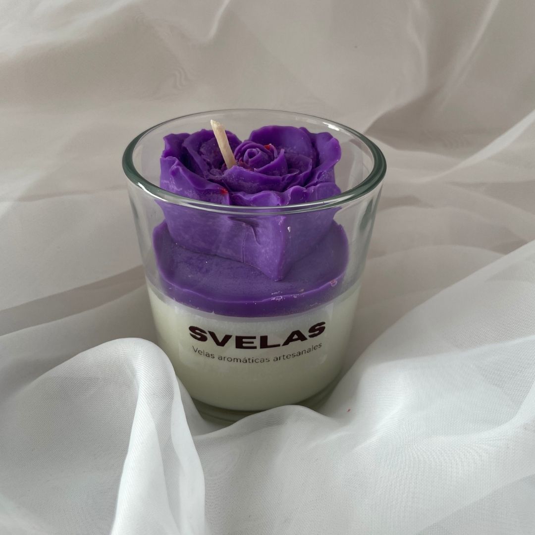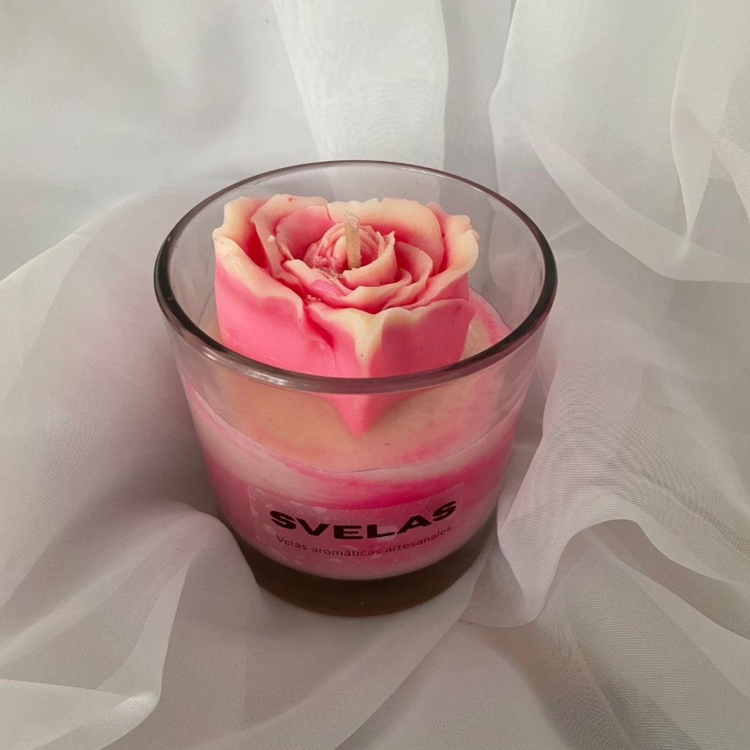 Vela de cera de soja en vaso de vidrio, coronada por un sofisticado aplique de flor tipo Peonía abierta. Un diseño que combina la calidez de la luz con la frescura de la naturaleza, ideal para decorar ambientes relajados y elegantes.