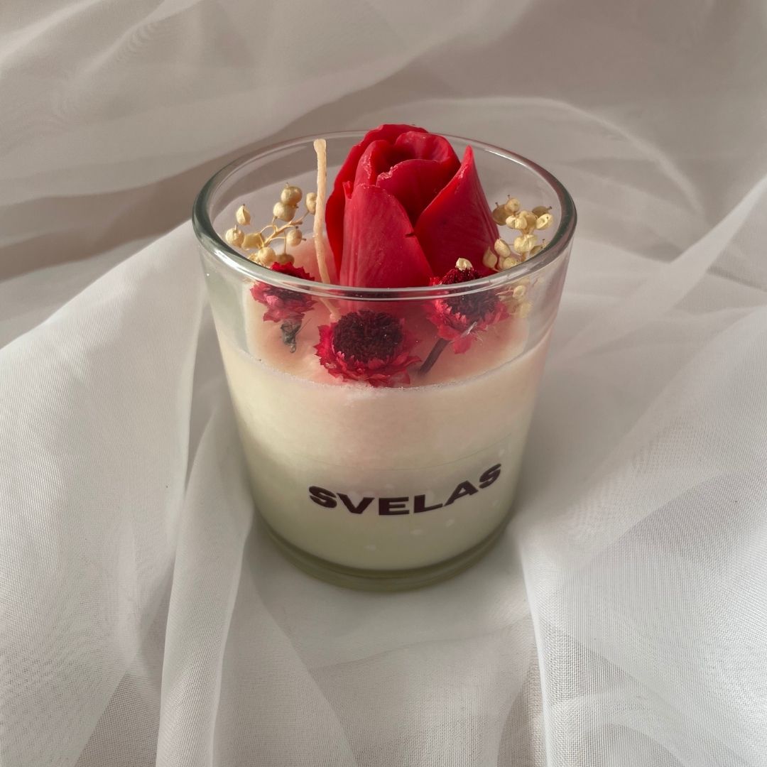 Vela de cera de soja en vaso de vidrio, protagonizada por un exquisito aplique central de tulipán moldeada a mano en alta definición. Su diseño captura la delicadeza de la flor con un realismo sorprendente, aportando un toque de elegancia clásica y sofisticación a cualquier ambiente.